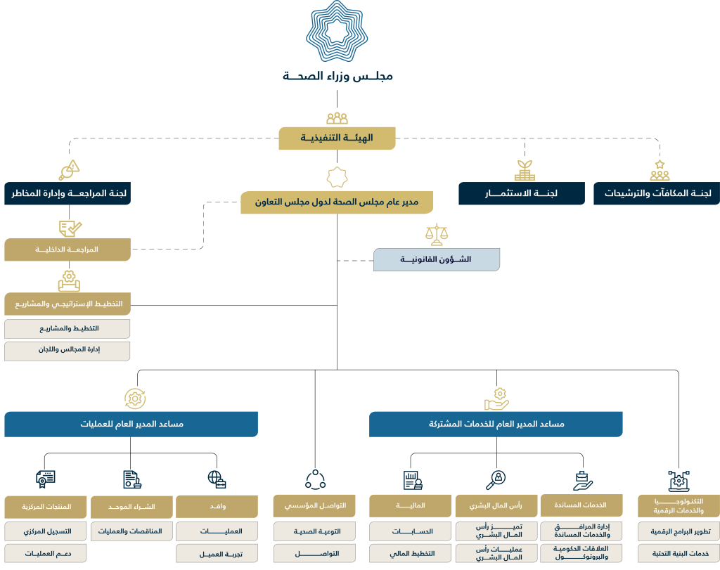 تعرف على أعضاء الهيئة التنفيذية في جميع دول مجلس التعاون الخليجي، واستكشف الهيكل التنظيمي لمجلس الصحة لدول مجلس التعاون بكامل تفاصيله، بما في ذلك الأدوار والمسؤوليات والمهام الموكلة لكل عضو، بالإضافة إلى آلية العمل والتنسيق بين الدول الأعضاء لتعزيز التعاون الصحي وتحقيق الأهداف المشتركة في مجال الرعاية الصحية والتنمية المستدامة.